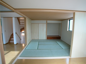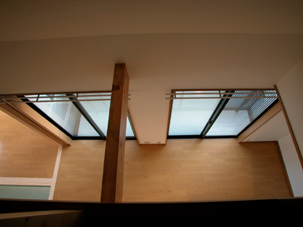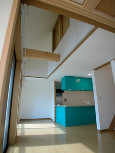 空間に広がりを持たす方法として、水平方向には可動間仕切り(通常は広いワンルーム空間で必要に迫られた時に部屋を仕切る)で空間の共有をしつつ、外部は隔絶されたバルコニーに植栽(ガーデニング等)を配しその空間を内部に取り込める様な空間イメージをした。上下方向には吹抜けを介して上部空間との会話、空気の流れ等を積極的に考慮して上下空間の繋がりで広がりを演出している。 |